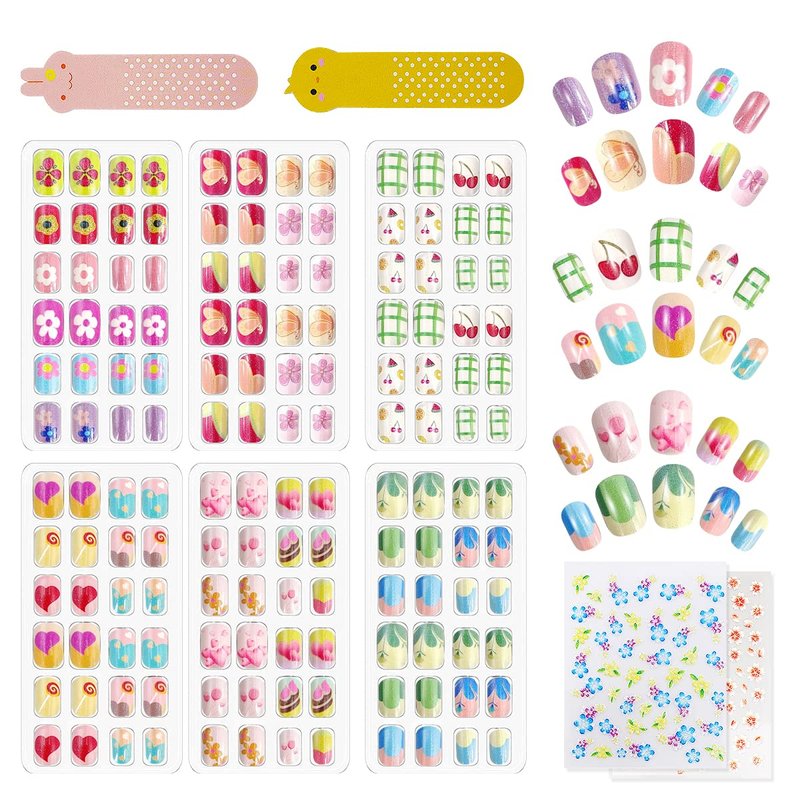 - ăMore styles to choose fromăThe kids glue-on nails are allowed to be reused many times, in a variety of colours and in sufficient quantities for you to create charming nail art styles. Our girls' press-on nails are printed with a variety of cute designs such as cats, bunnies, bright colours and more. Easy for kids to DIY a variety of nail styles to suit different dress codes.