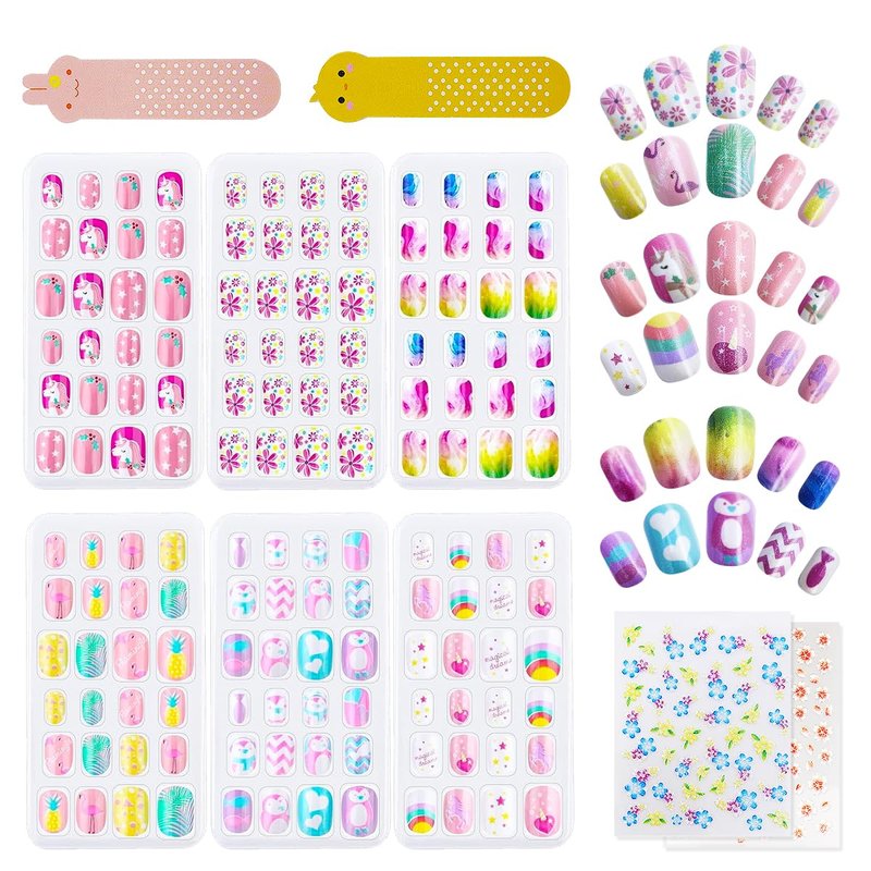 - ăVariety of sizesăThe funny press on nails for kids comes with 6 boxes of girls fake nails, each box contains 24 pieces full cover short false nails in different sizes, 144 pieces in total. Glue on nails for kids allow reusing the nails tips multiple times, assorted colors and enough quantity for you to create charming nail art styles.