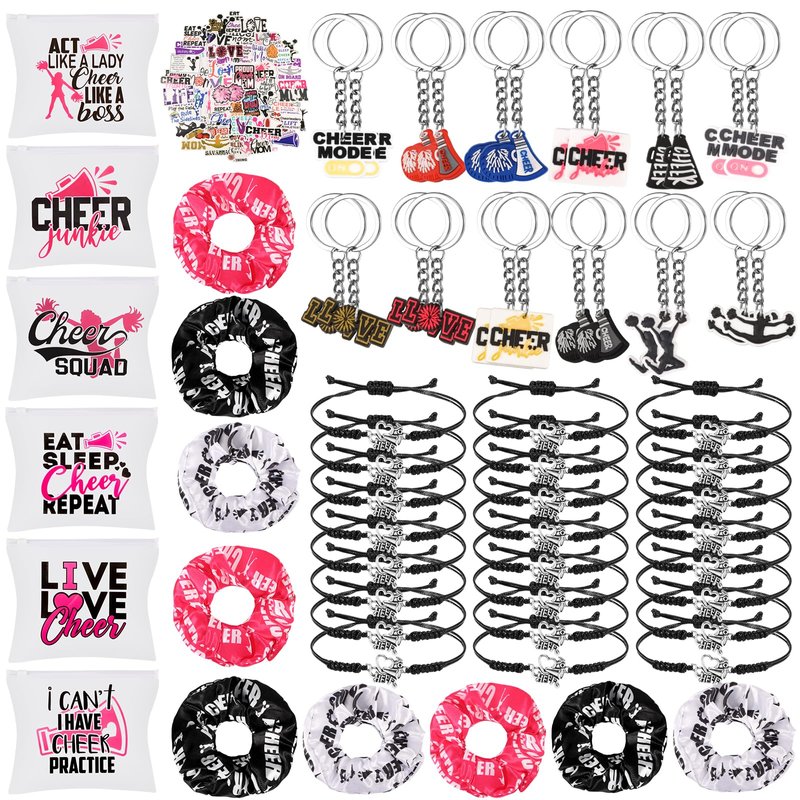- ★Packaging content: You can receive 146 cheerleading gifts, including 24 bracelets, 24 keychains, 24 makeup bags, 24 cheer hair ties,and 50 stickers, in sufficient quantity to meet the needs of you and your team。