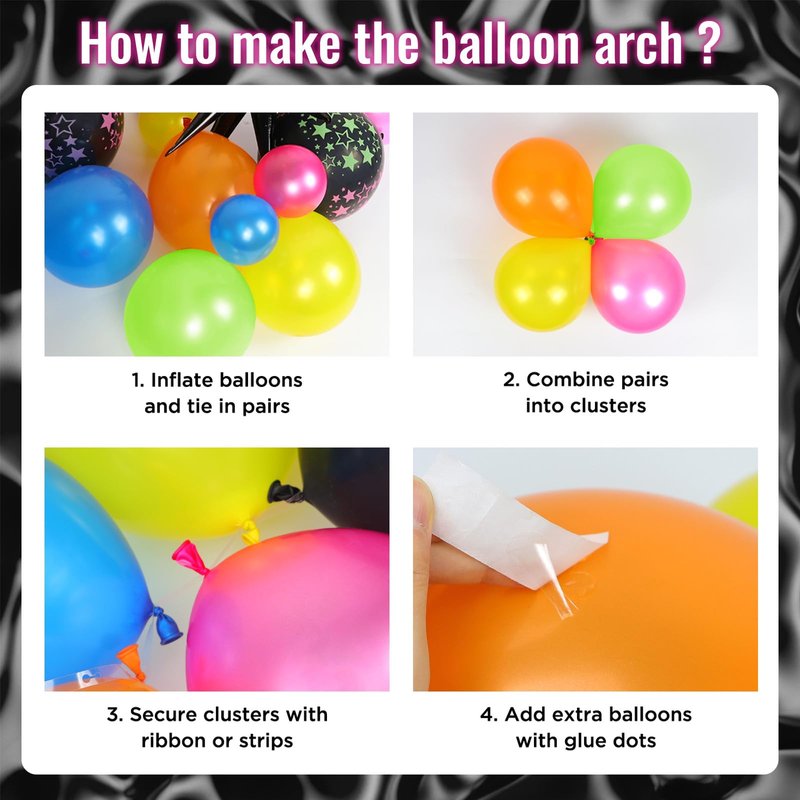 - Easy to Assemble: The package include ribbons, glue dots, decorative strip to help you effortlessly assemble the glow in the dark balloon arch. Firstly, blow up all the balloons with a hand pump. Then, fix the balloons together with ribbons or decorative strip to form a cluster balloons and hang it on the party background. Finally, stick the small balloon to decorate balloon arch with glue dots