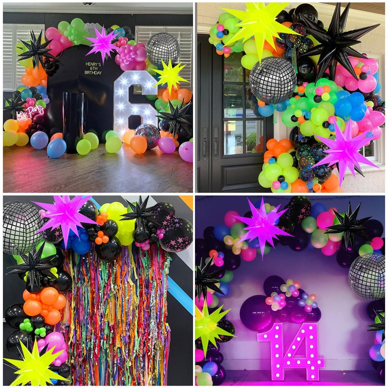 - What You Get: The neon balloon arch kit include 20pcs yellow balloons(10inchx10, 5inchx10), 20pcs hot pink balloons(10inchx10, 5inchx10), 20pcs lime green balloons(10inchx10, 5inchx10), 15pcs orange balloons(10inchx5, 5inchx10), 20pcs purple balloons(10inchx10, 5inchx10), 20pcs blue balloons(10inchx10, 5inchx10), 12inch neon balloonsx25, 22inch foil balloonsx3, 22inch disco balloonx1, ribbonx1, decorative stripx1, glue dotsx100