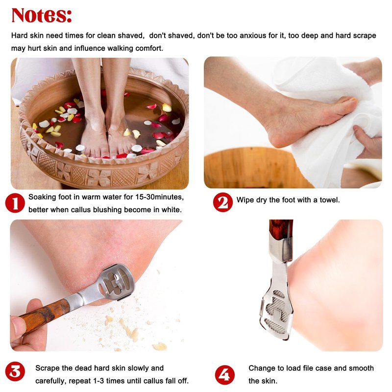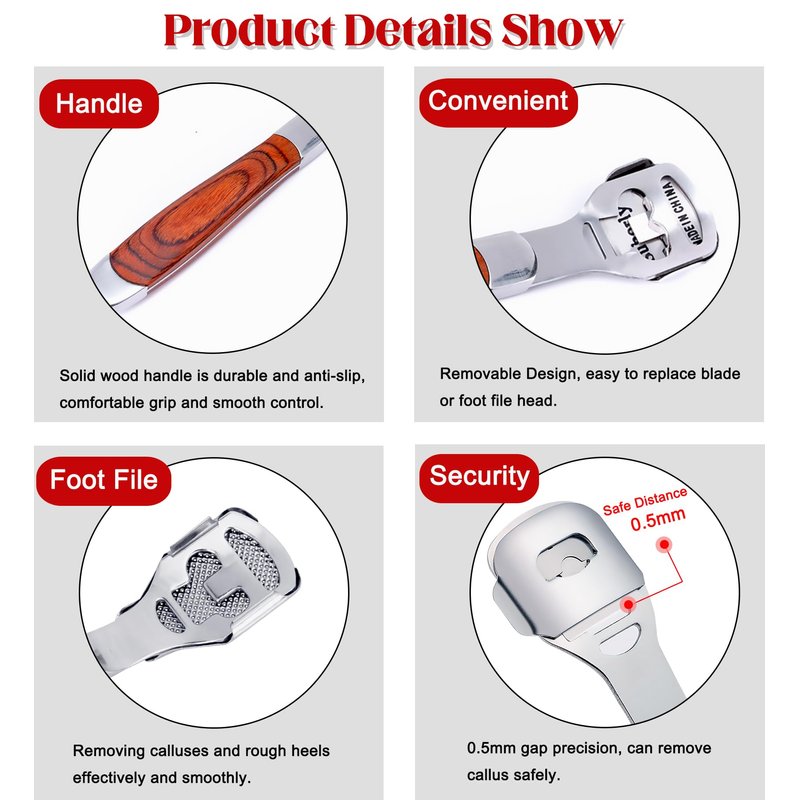 - 🏆[Premium Quality Callus Remover]: This Pedicure Callus Shaver Set is made of high quality stainless steel material and Unique Non-slip wood handle. So the foot file heel scraper for feet provides most comfortable grip and smooth control.