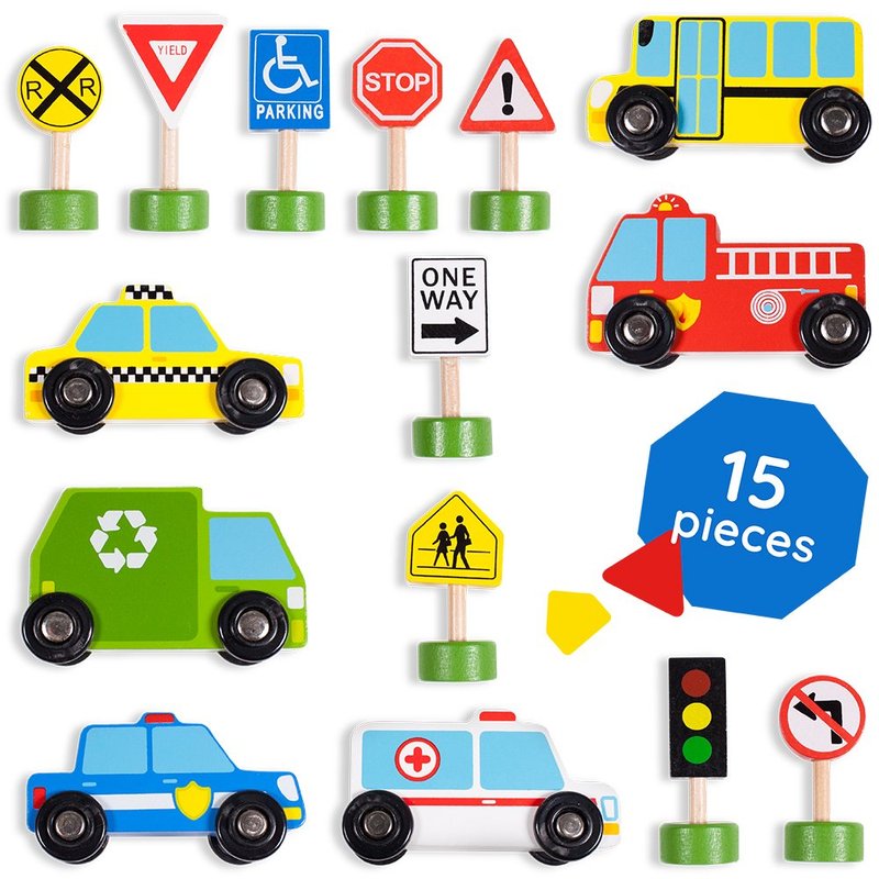 - BUSY CITY: 6 Wooden cars and 9 common street signs with slotted storage box. Ages 3+
