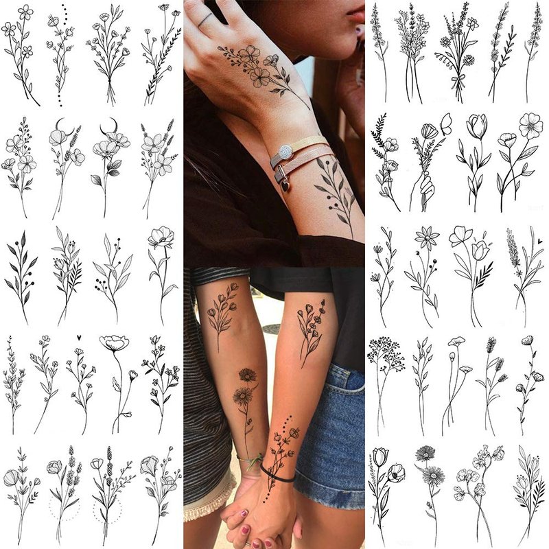 15 Sheets FANRUI Sexy Tiny Branch Black Flower Temporary Tattoos For Women Girl Neck Realistic Floral Bouquet Small Tattoo Temporary Lavender Fake Tattoo Sticker For Adults Face Hands Kit