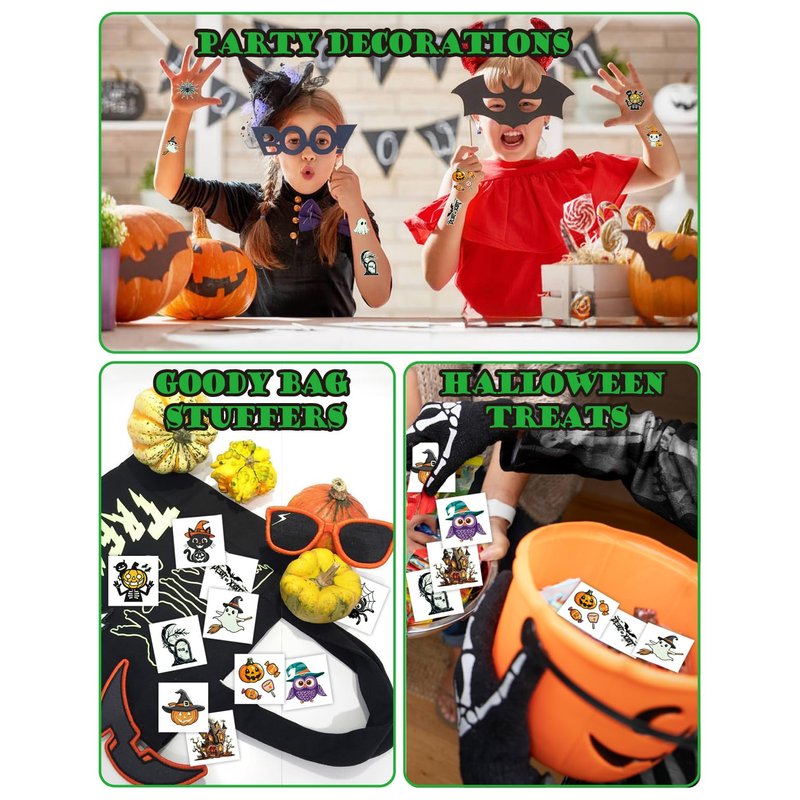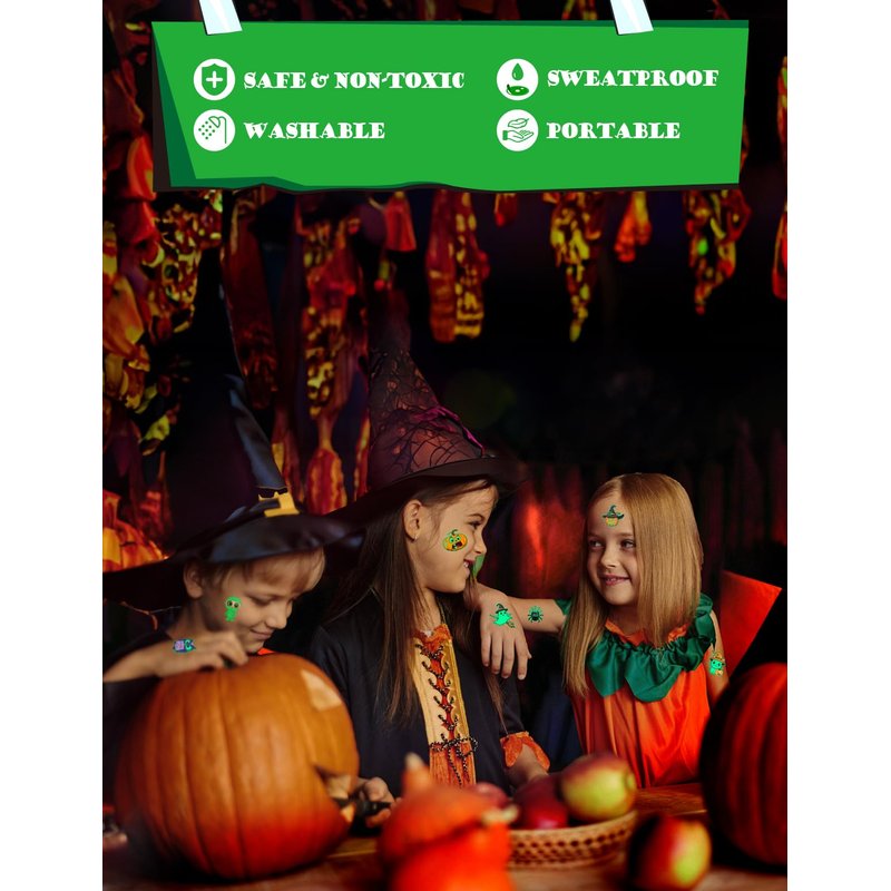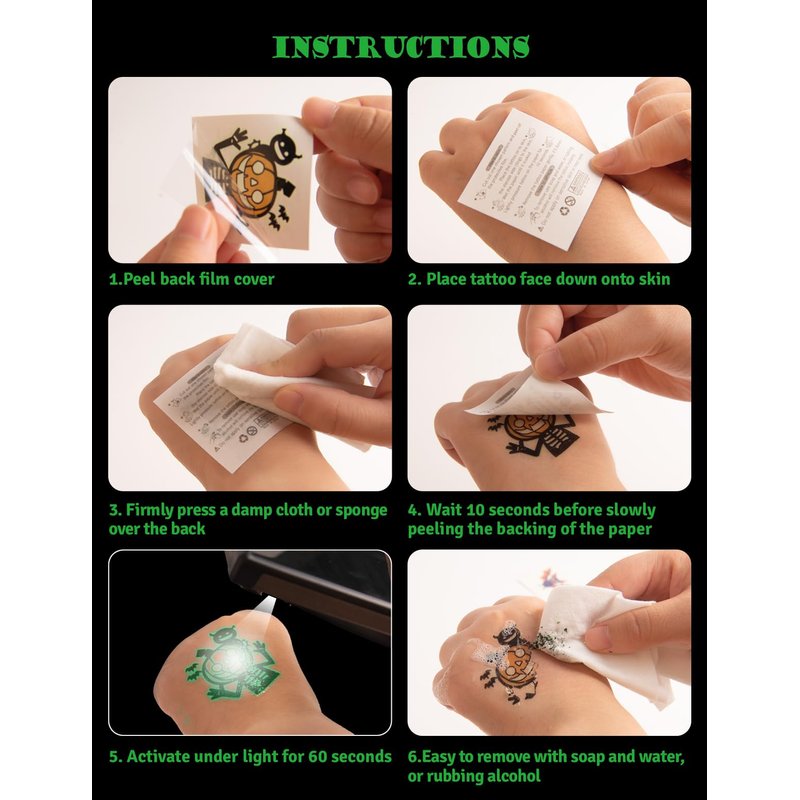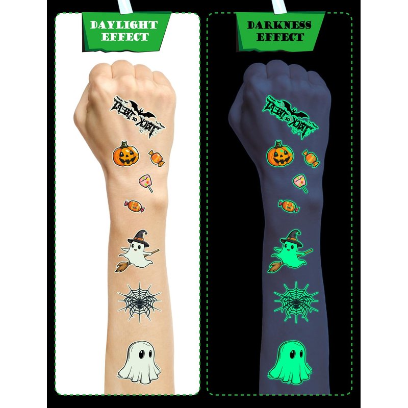 - 【Glow-in-the-Dark Tattoos Activated by Light】These Halloween tattoos for kids glow in the dark when activated by light for 60 seconds, adding a magical touch to your Halloween celebrations. Kids will be thrilled to see their favorite designs light up during the festivities.