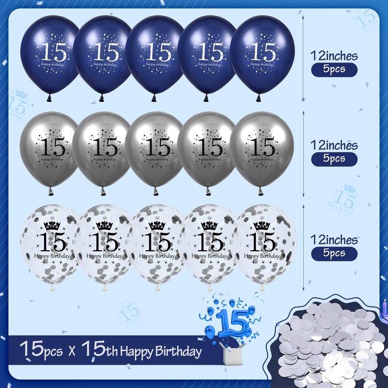 - 15th Birthday Decorations: Includes 15 navy blue and silver balloons with "15th Happy Birthday" text