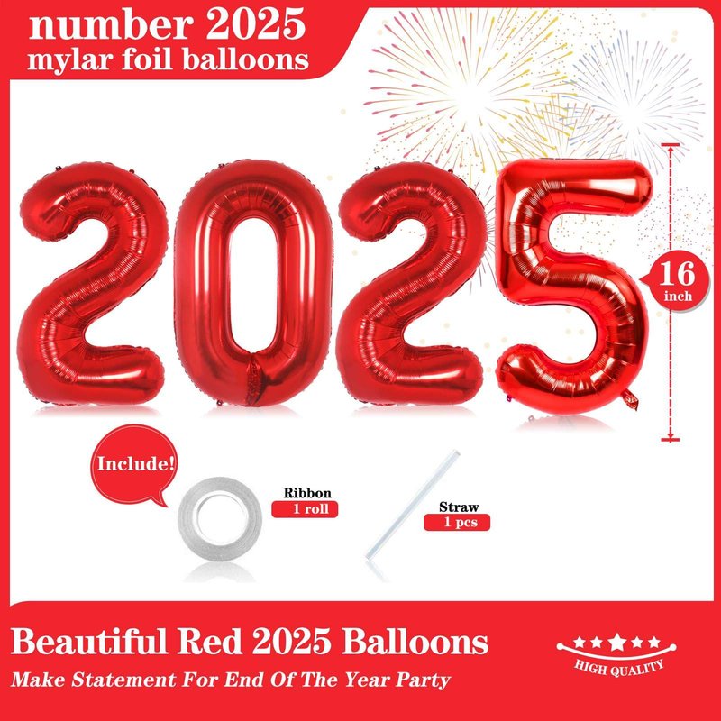 - WHAT YOU WILL RECEIVE: You will receive a set of 16-inch Red 2025 Number Balloons (uninflated), along with a 33-foot roll of ribbon and one straw. These 2025 number balloons are designed to fulfill your balloons needs for a New Year-themed party.