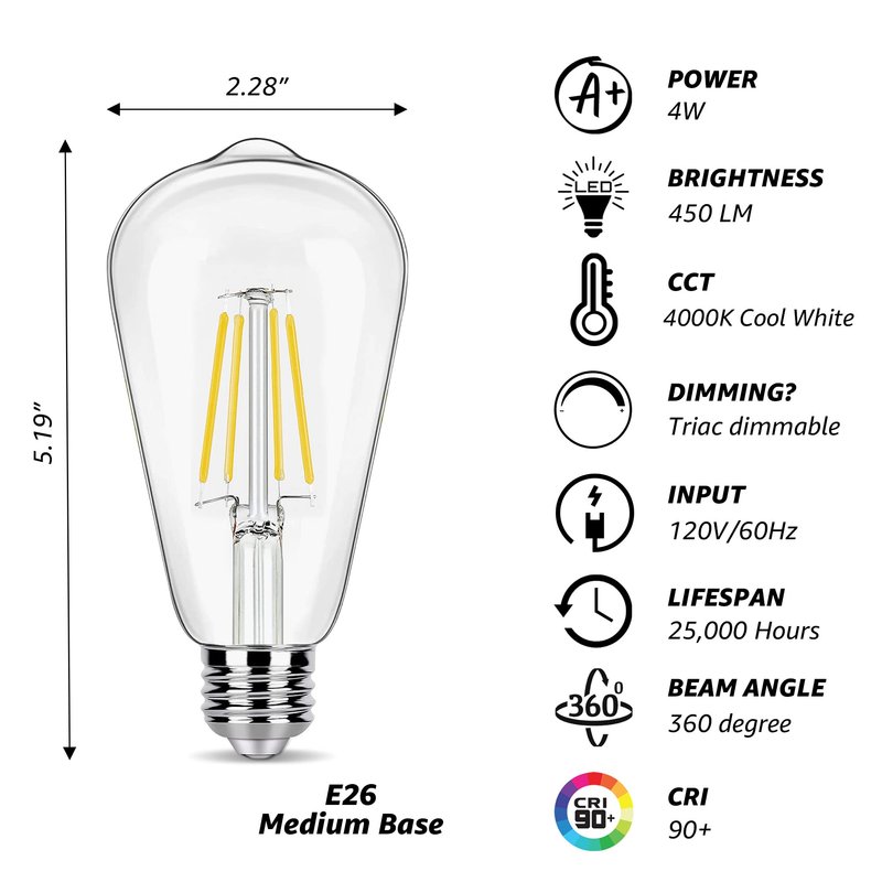 - High Light Quality: The vintage led bulbs adopt high efficiency driver, emit ambient light without buzzing, new LED filament bulb tech anti-glare and without flickering.