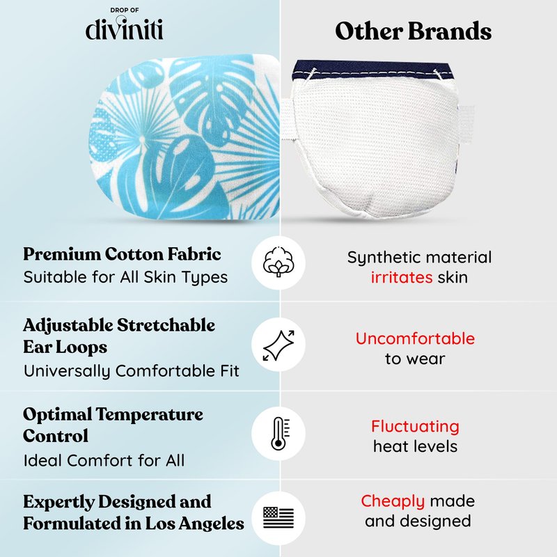 Soothing, Self-Heating Eye Warmer for Dry Eyes (16-Pack) Warmth and hydration are the foundation of eye wellness. Get the relief you need with soothing, self-heating eye heating pad from DiviniTi! How Do Our Heat Eye Mask - Moist Heat Eye Compress Work?1. Open it: Remove one of the disposable heated eye masks from the packaging. Carefully rip the perforated ear loops. It will begin warming automatically as enzymes in the air activate heating elements in the steam mask. 2. Put it on: Place the comfortable elastic hooks around your ears. The exterior is made of cotton for velvety comfort around your eyes. 3. Get relief: Enjoy instant relief, fine, moist steam around your eyes. Our eye mask warms up to 110°F – promoting blood circulation for spa-like comfort & eye-relaxing relief. What Can Our Masks Help You With? - Dry Eye Mask - Itchy Eyes – Migraines – Allergies – Headaches – Jetlag - Sinus Pressure - Dark Circles - Eye Redness - Eye Fatigue – Insomnia How Our Self-Heating Eye Masks are Superior - Self-Heating Technology: Automatically warms up when you remove it from the packaging. - Warms up to 110°F: Warmer than other masks, our eye mask heat is just right: warm, comfortable & deeply soothing. - 20-30 Minutes of Warmth: Other products go cold after 10 minutes. With DiviniTi enjoy a self warming eye mask for dry eyes that lasts for up to 30 minutes. - No Microwaving or Charging: Since the eye masks are self-heating, you don’t have to worry about microwaves, batteries or cords. Simply put them on for fast, easy relief! - Clean, Lightweight & Comfortable: Unlike a thick heated eye compress for dry eyes, our heated eye masks are lightweight & comfortable to wear. - One Size Fits Most: Our strong ear loops are designed to stretch & fit comfortably on a variety of head shapes, ensuring a secure & comfortable fit for all. stye eye compress lavender eye mask moist heat mask eye stye treatment mask for dry eyes heated eye mask for dry eyes electric