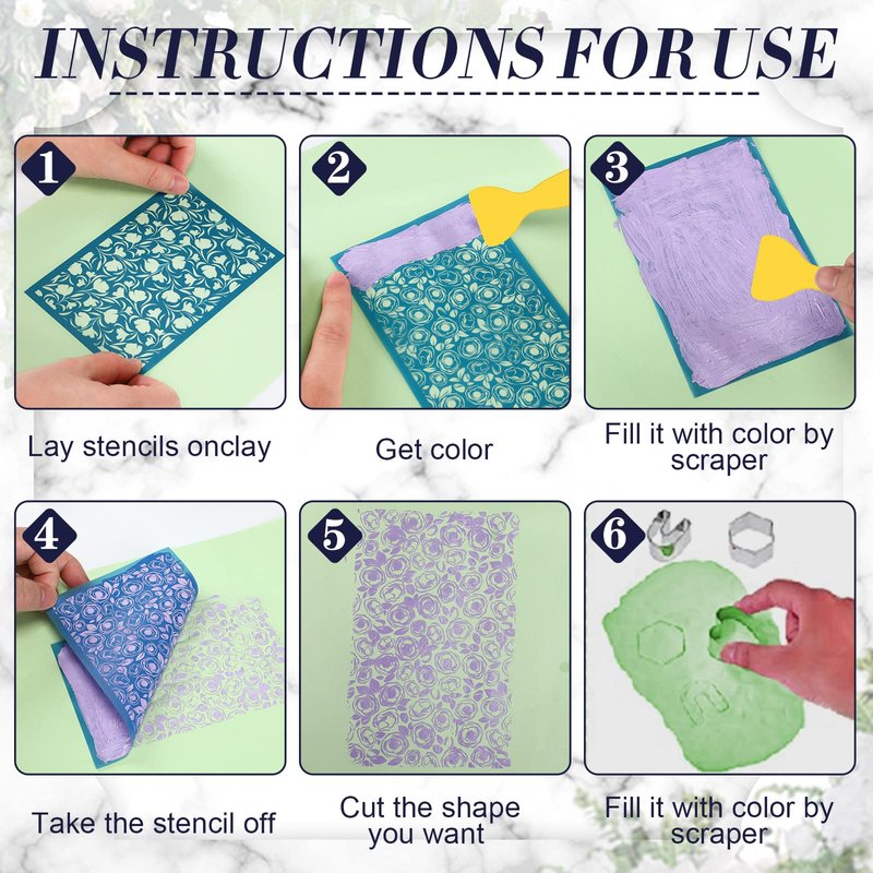 - Easy Steps: silk screen stencils for polymer clay are simple to apply, just prepare materials for DIY, then place a silk screen where you want to print patterns, fix it, paint colors you like and take off the silk screen after painting, finally, cut to get your delicate handicrafts