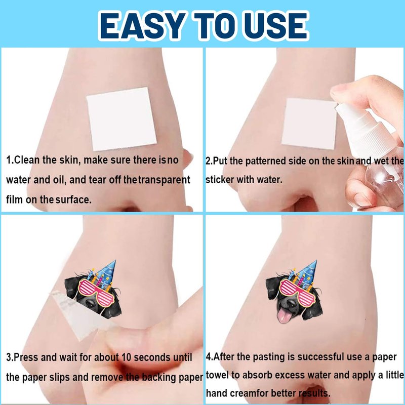 - How to Use: Cut each puppy tattoo out of sheets and remove the sheet clearly. You can stick it on hands, face, arms or wherever you feel safe. Moreover, you put it down on glasses, clothes, and a smooth flat. After that, you wet it thoroughly with water and wait for 20-30 seconds, you get rid of the backing paper