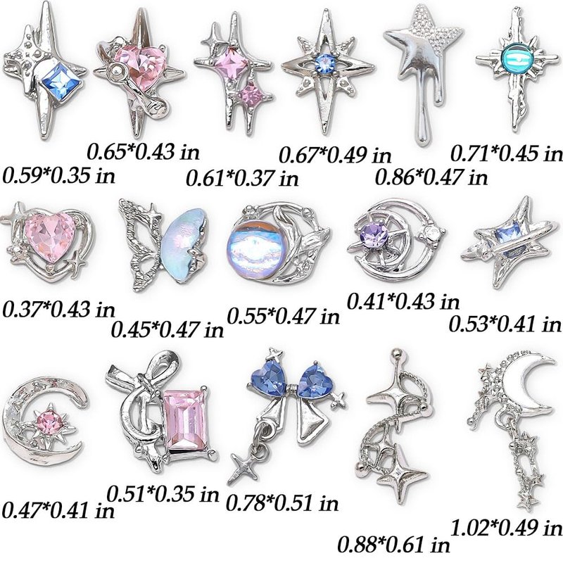 16 Styles Luxury Moon Star Nail Charms for Acrylic Nails Alloy Rhinestone Star Moon Nail Art Charms 3D Bow Butterfly Silver Nail Charms Y2k Nail Accessories Metal Nail Jewels for Nail Art Supplies