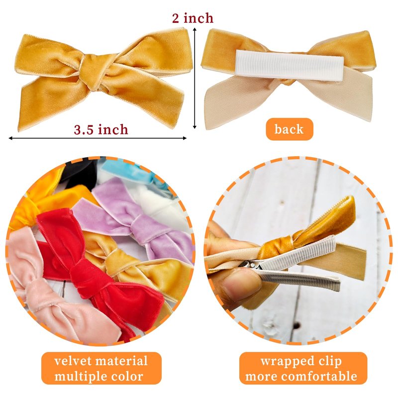 - 【PACKAGE INCLUDES】16pcs colorful velvet bow hair clips(8 color,each comes with 2). Each size is about 4 inch. The diverse colors and the classic style could match your little girl's various outfits, suitable for all seasons