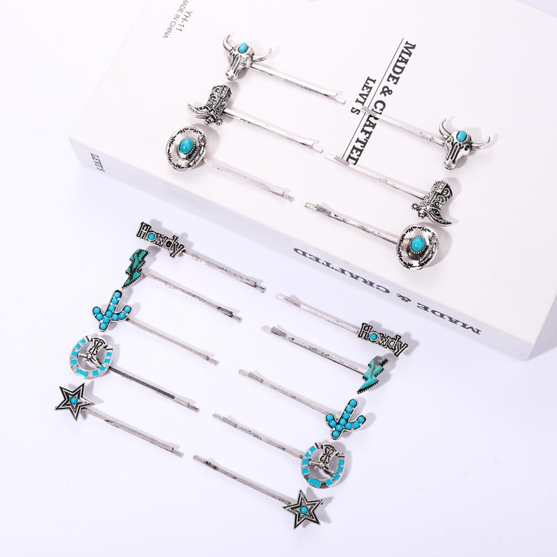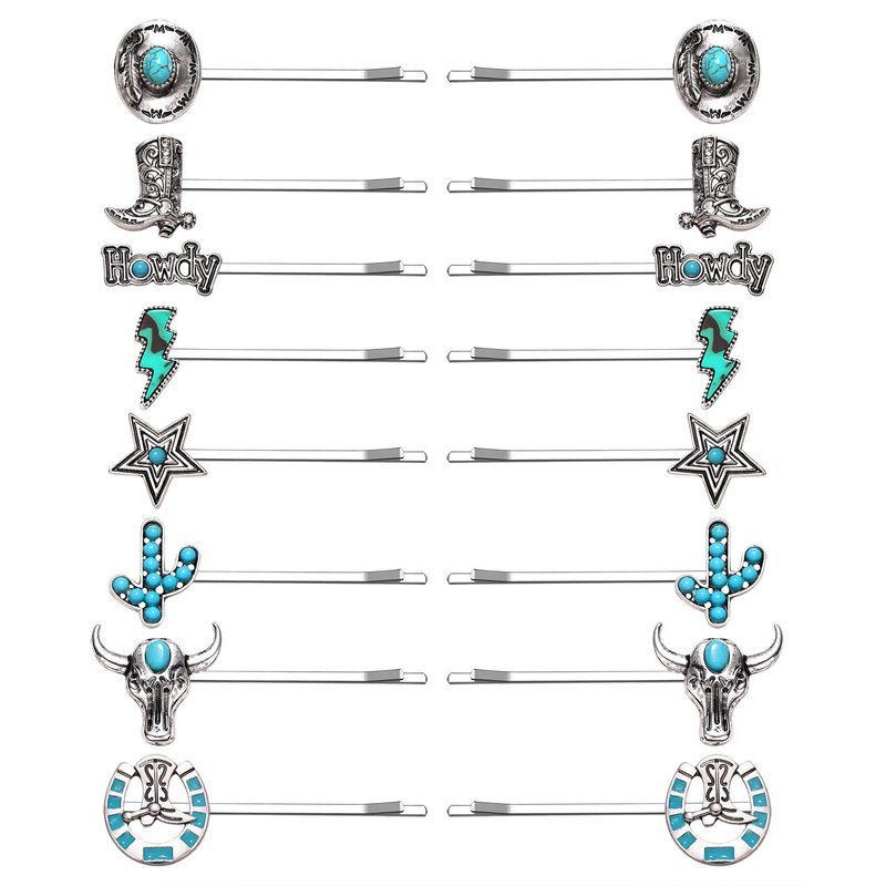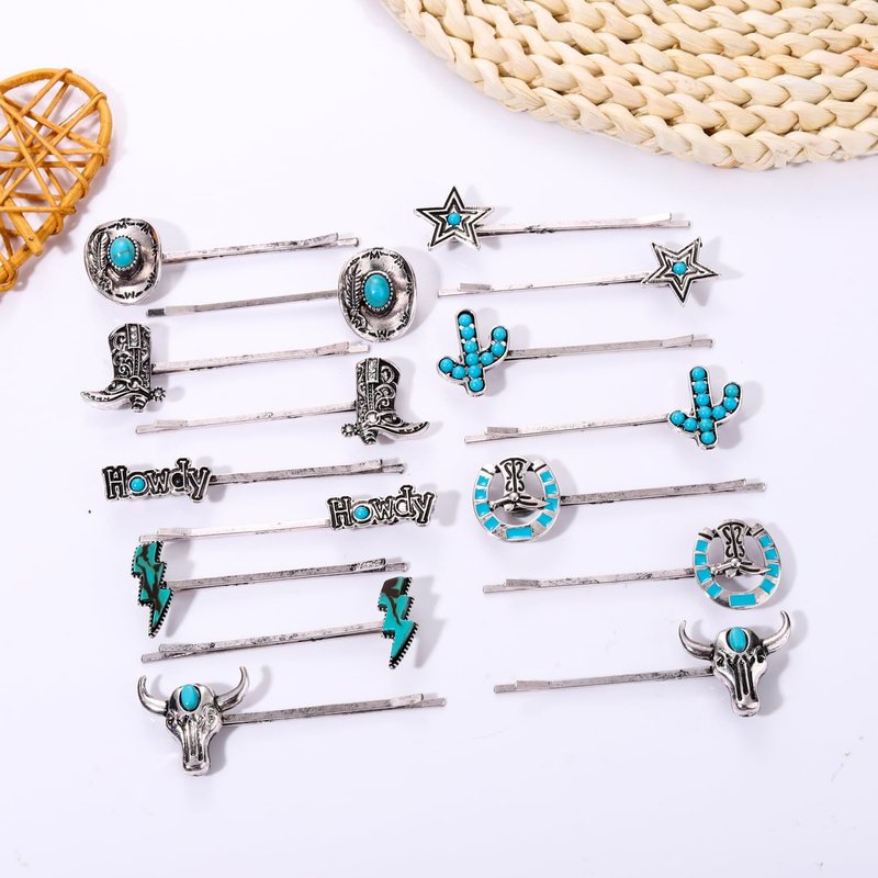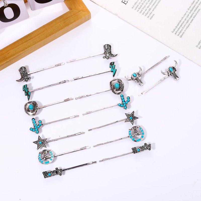 - Material & Size :These silver metal western country style bobby pins set are decorated with vintage turquoise stones and western cowboy charms. They're perfect for your beach vacation this summer! boho turquoise hairpins length : 2.5" Material: high quality alloy , natural stones Lead Compliant, Nickle Free Perfect for: Wedding hair Prom hair Flower girls Bridesmaids Homecoming updo Everyday use.Is also perfect as an everyday or office hair clip, it would also make a lovely gift.