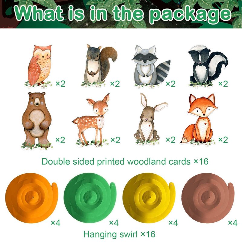 - Woodland Themed Design: our woodland hanging swirls decorations featured green leaves and animals, designed lovely and funny bear, bunny, deer, owl, squirrel, fox, and more. It will decorates your party much beautiful and lively