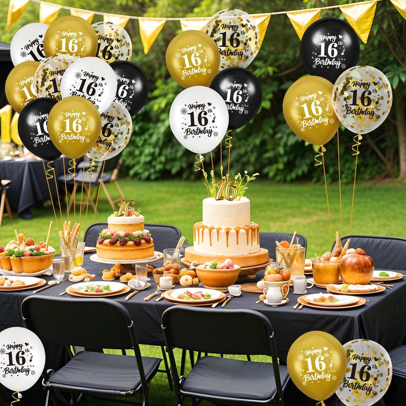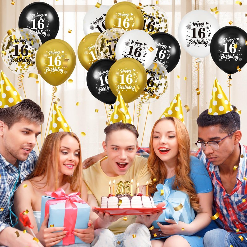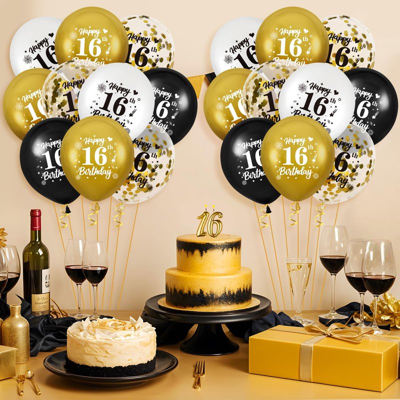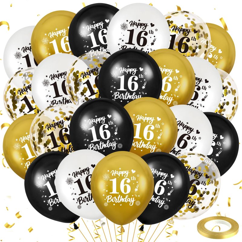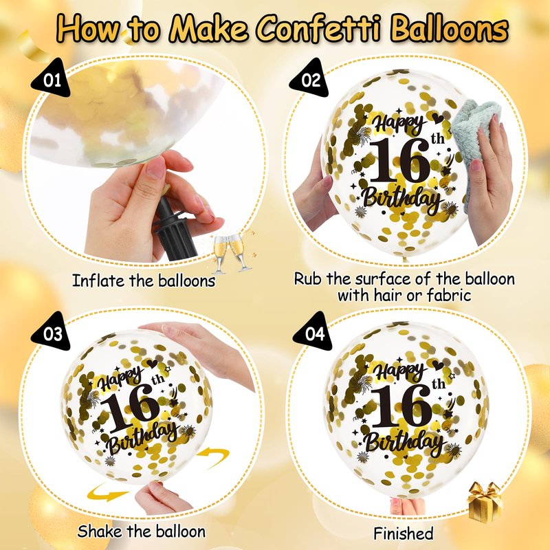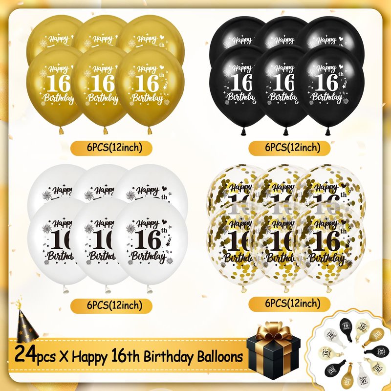- 🎈[What You Will Get]-You will receive 24 pieces of 12-inch happy 16th birthday latex balloons, including 6pcs yellow gold balloons, 6pcs black balloons, 6pcs white balloons, and 6pcs confetti balloons, suitable for a 16th birthday party decoration