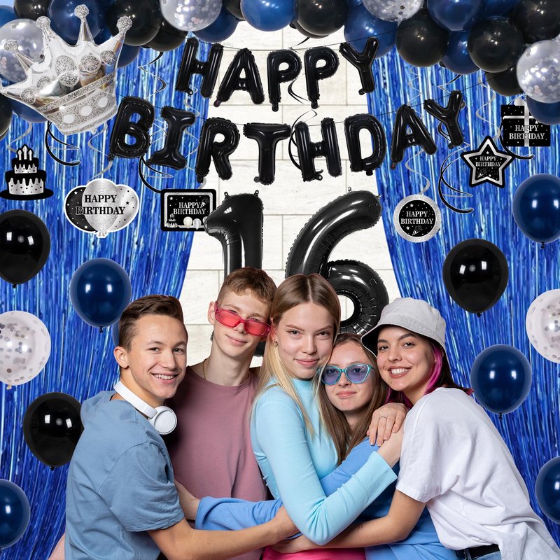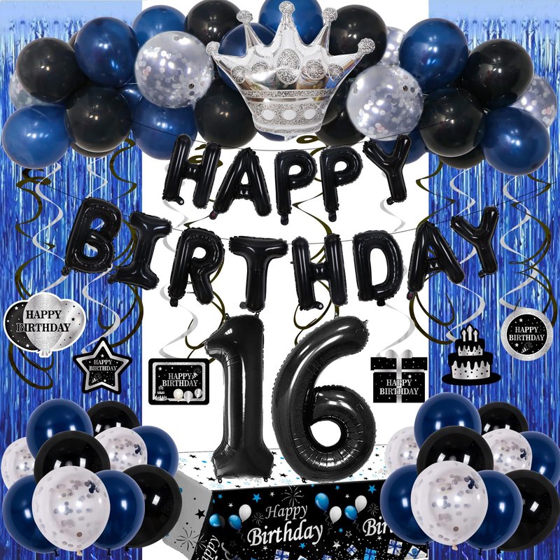 - 💙 16th Birthday Decorations - 73PCS Great Value 16th birthday party decorations for boys include 1 x black HAPPY BIRTHDAY Balloons banner, 1 x 32" number 16 foil balloon, 2 x blue fringe curtains, 1 x birthday tablecloth, 6 x happy birthday pattern card, 6 x black hanging swirls, 6 x silver hanging swirls, 20 x 10”dark blue balloons, 15 x 10”black balloons, 10 x 12” silver confetti balloons, 1 x 12” crown foil balloon, 1 x balloon chain, 1 x dot stickers, 1 x ribbon.