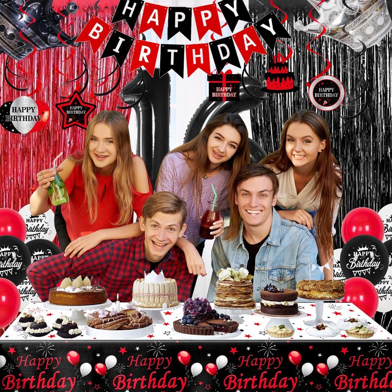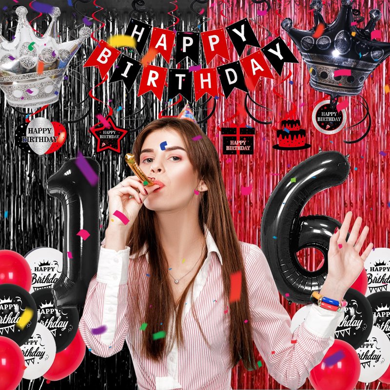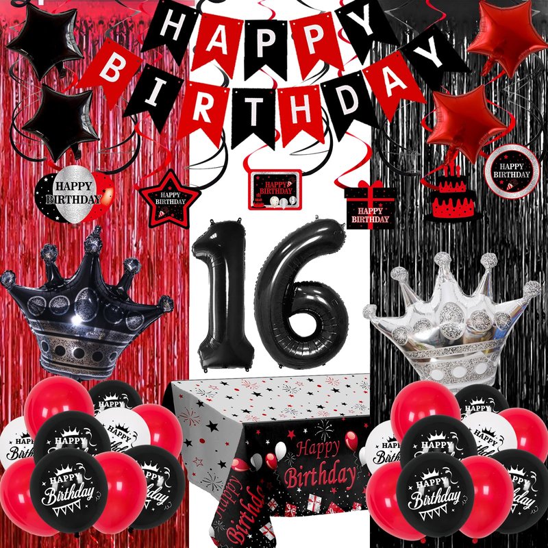 - 【Great Value Pack 16th Birthday Decorations for Boys and Girls】16th birthday decorations including 1 x red black HAPPY BIRTHDAY banner, 8 x 10 red latex balloons, 8 x 12 black HAPPY BIRTHDAY balloons, 4 x 12 white HAPPY BIRTHDAY balloons, 4 x 10 star foil balloons(2 red+2 black), 2 x crown foil balloons(red+black), 2 x 32 number "16" foil balloons, 6 x black hanging swirls, 6 x red hanging swirls, 6 x happy birthday pendants, 1 x tablecloth(70.86*42.51in), 2 x foil fringe curtains.