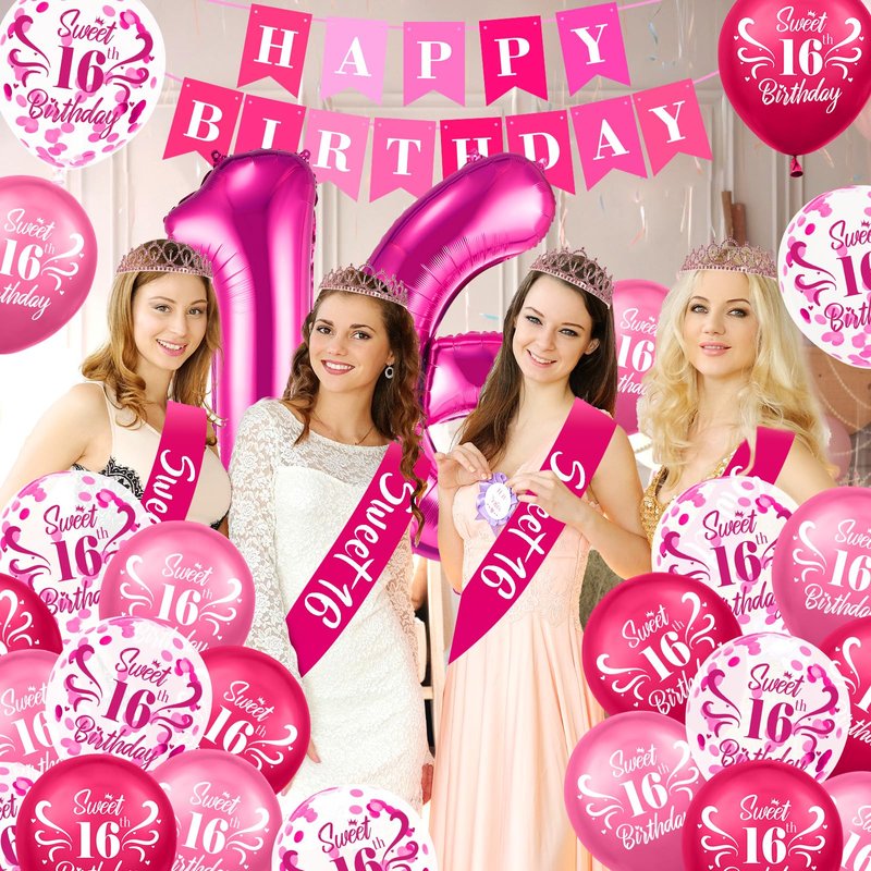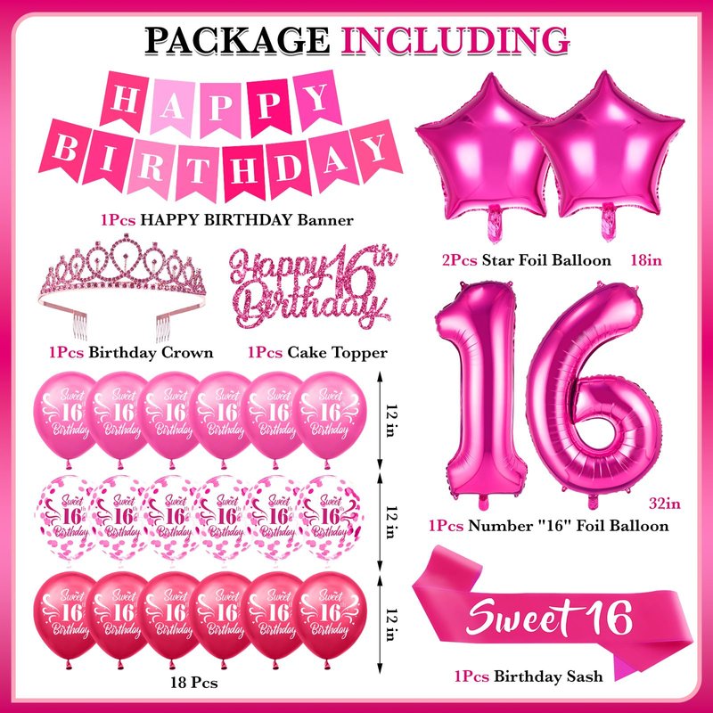 - 【What You Will Get】The set includes 1pc "HAPPY BIRTHDAY" banner,1pc 16th birthday crown, 1*32 inch hot pink number "16" foil balloon, 2*18 inch star foil balloon, 18*12 inch latex balloons, 1pc pink glitter cake topper, 1pc pink birthday sash with letter "sweet 16"; These sweet decorations are perfect for organizing a girl's birthday party
