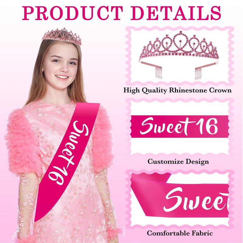 - 【Sweet 16th Birthday Decorations Set】Pink theme 16th birthday decorations are perfect for happy 16th birthday party according to your needs, make a special and memorable party for your girl; The pink glitter birthday crown and sash create an elegant and sophisticated look for the birthday girl; The package also includes a pink cake topper to add an extra touch of sparkle to your cake decoration