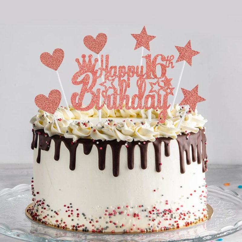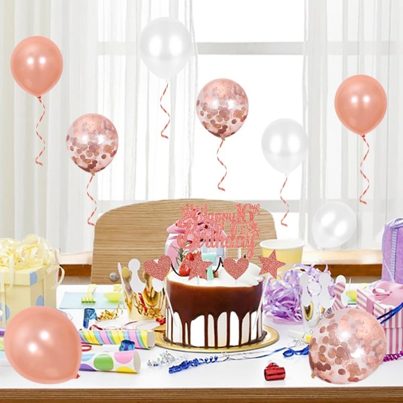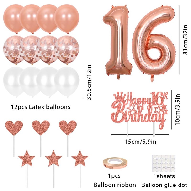 - 【Package】: 1 x Rhinestone Crown, 1 x "It's my 16th birthday" Sash, 1 x number "16" foil balloon, 1 x Pin, 12 x Latex Balloons(Rose gold, White), 7 x Cake Topper, 1 x 10m balloon ribbon, 20pcs balloon glue-dots.