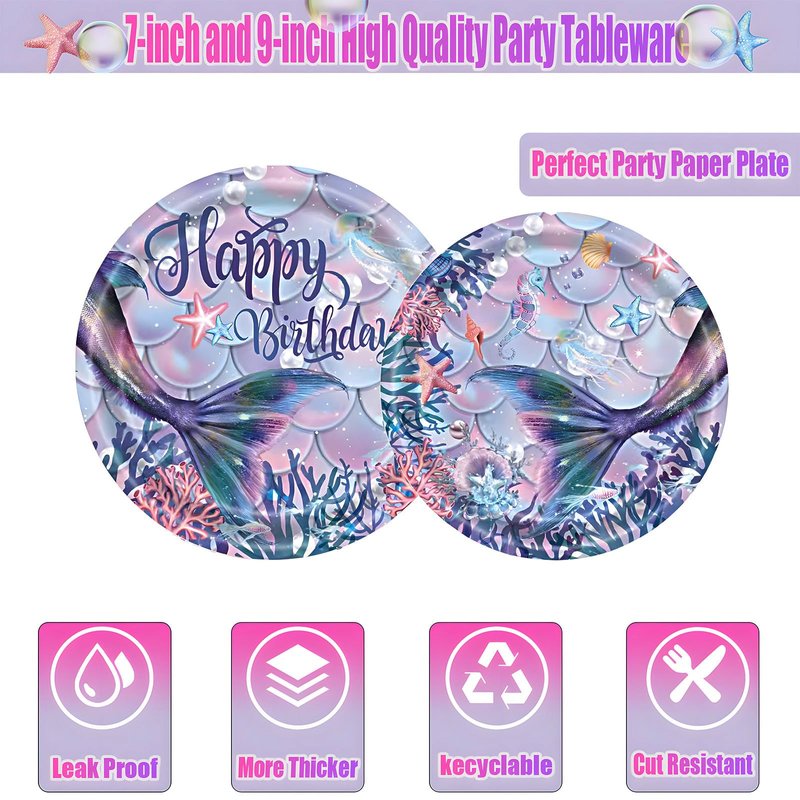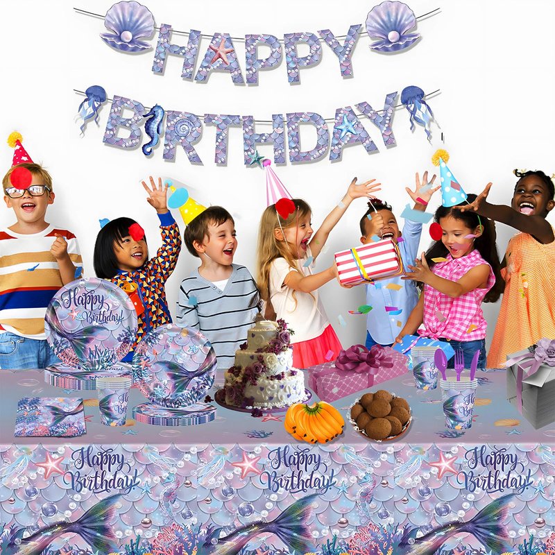 - 【Mermaid Party Decorations】: Our mermaid theme party decorations set specifically includes 1×birthday banner, 1×mermaid tablecloth (54×108 inches), 24×napkins, 24×cups, 24×forks, 24×knives, 24×spoons, 24×7-inch plates, 24×9-inch plates.