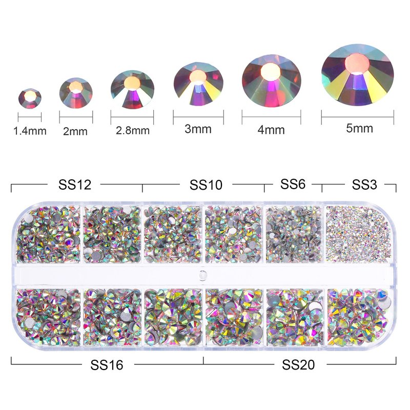 - 6 Mixed sizes: SS3 (1.4 mm), SS6 (2 mm), SS10 (2.8 mm), SS12 (3 mm), SS16 (4 mm), SS20 (5 mm), approx. 288 pieces each size; All AB stones are packed in a compartment individually according to their sizes, convenient to pick out the items you need