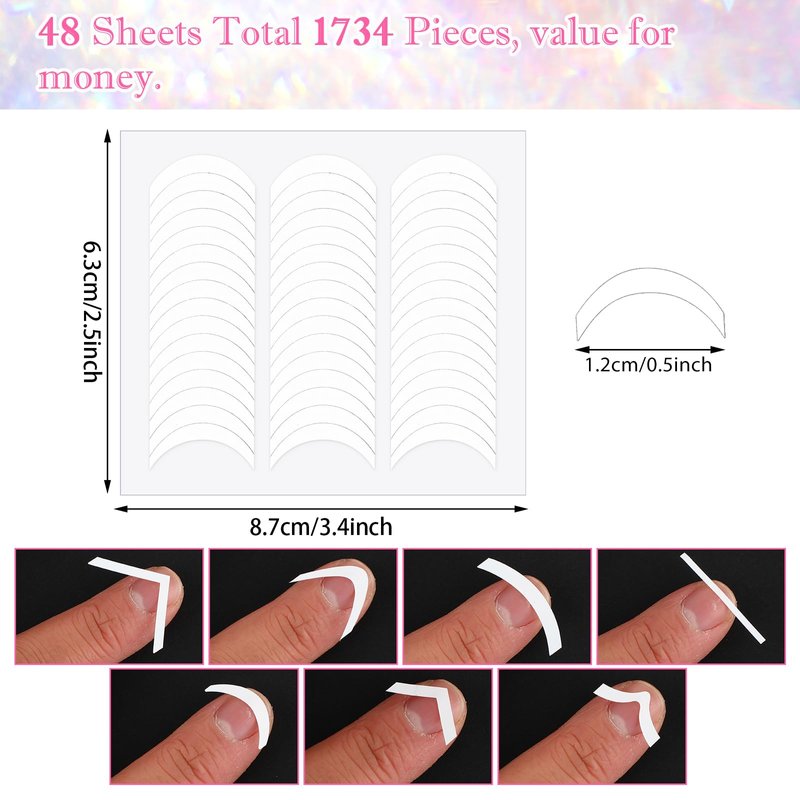 - French Manicure Kit - Include 1734 pieces/48 sheets of french tip nail guides, 8 kinds of manicure strips designs, such as smile lines, straight lines, waves and others, suitable for different nail sizes and radians. DIY your own nail arts with your imagination.