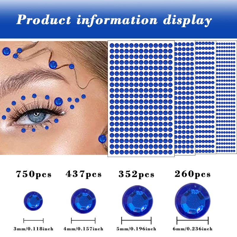 - 【Set Includes】Package contains 4 sheets of self-adhesive diamond stickers, including 750pcs 3mm, and 437pcs 4mm, 352pcs 5mm, 260pcs 6mm. You will look more charming and gorgeous with these shimmering face body gems.