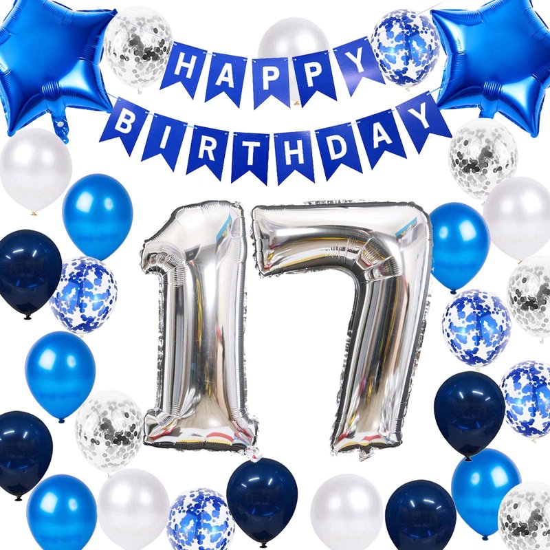 - 17th Birthday Decorations Blue Sets Include: 1 * blue 'HAPPY BIRTHDAY' Letter Banner, 1* number 17 balloons, 2* star foil balloons, 25 latex party balloons in 5 styles(5* blue color, 5* white confetti, 5* white, 5* navy blue, 5* blue confetti), 1* 10m ribbon. Total 31packs in one package.