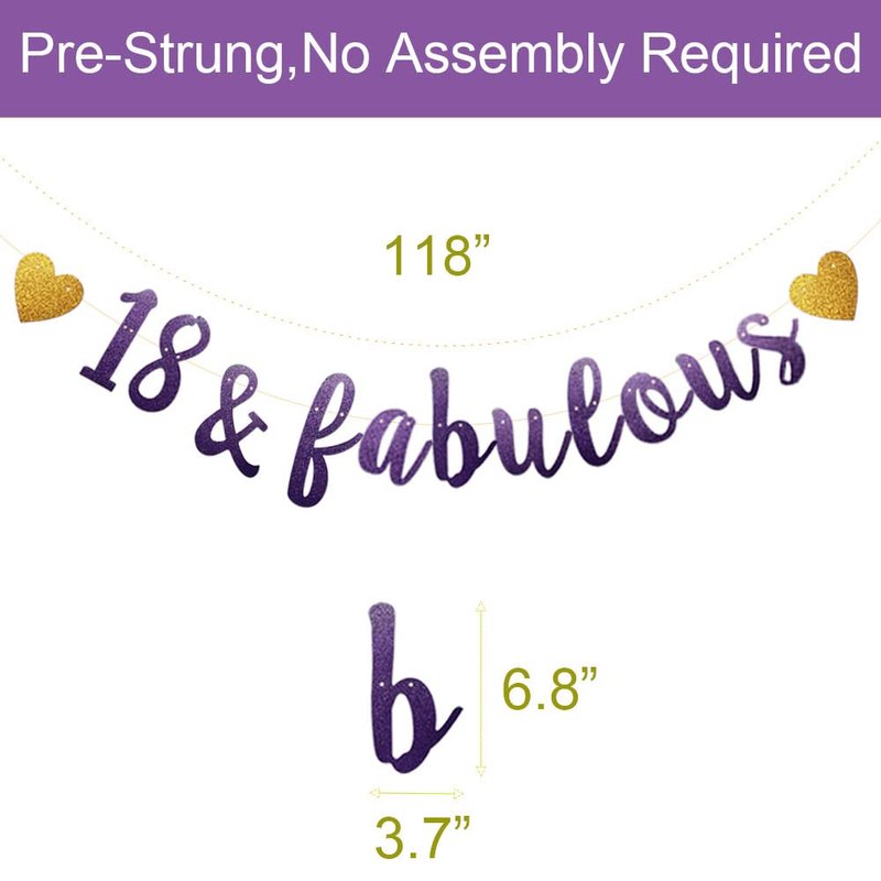 The package includes 1 set "18 & fabulous” Banner, which has been strung and can be hung directly.The banner is special design for 20th birthday party decoration supplies, with purple glitter letters. The rope is approx 118 inch long, and you can adjust the arc distance and the distance between letters you like.The banner is not only a decoration, but also a choice to be photo prop and backdrop, perfect for birthday party Supplies !