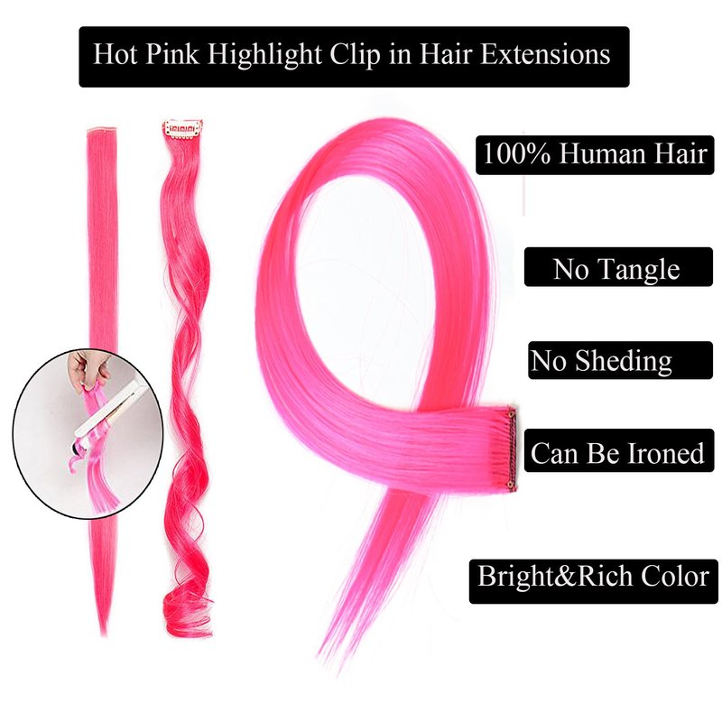 18 Inch High light Clip in Human Hair Extensions 100% Straight Clip on Party Highlights Colored Hair Extensions 6 Pieces/set (Hot Pink)