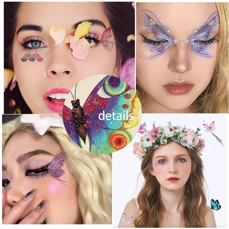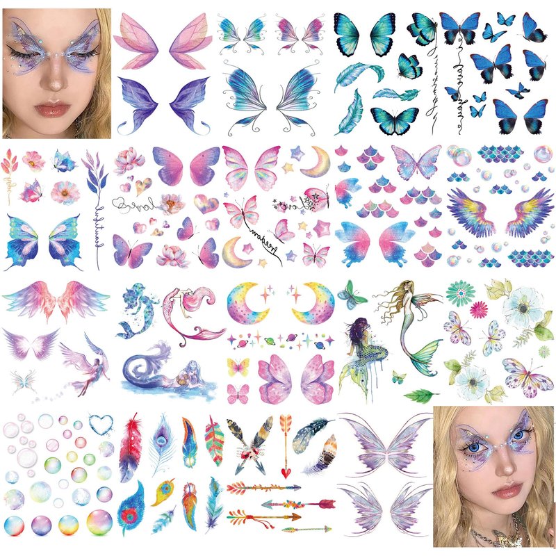 - 200+ Styles Glitter Face Tattoos for Party Makeup -- Super adorable glitter waterproof temporary tattoos. With different butterfly, flower, Unicorn, Mermaid,wing patterns. you can used these tattoos for arms, face, shoulders, back, eyeshadow, legs and worn any where on your body shows your personality