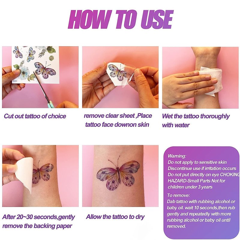 - 18 Sheets Glitter Butterfly Tattoos for Girls Women -- Easy to use. Simply moisten the tattoo sticker with water or a wet towel for 30 seconds to take effect. And it can be easily removed with baby oil or cleaning oil or olive oil.