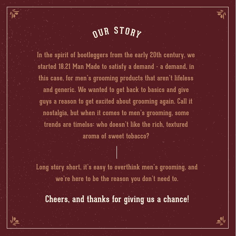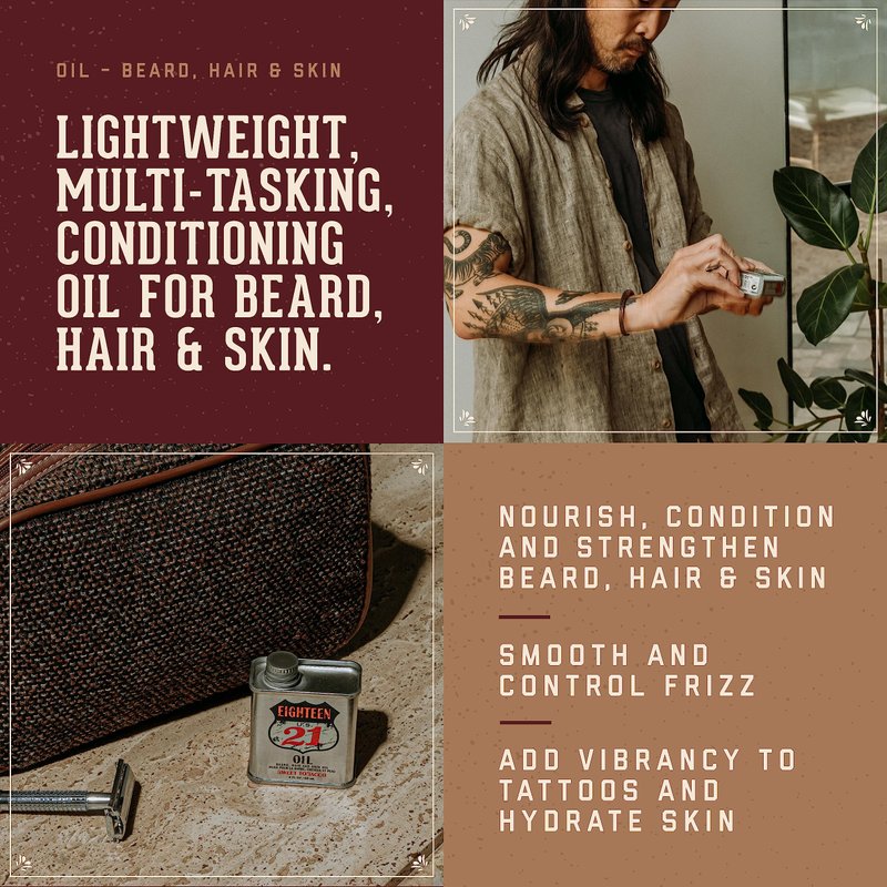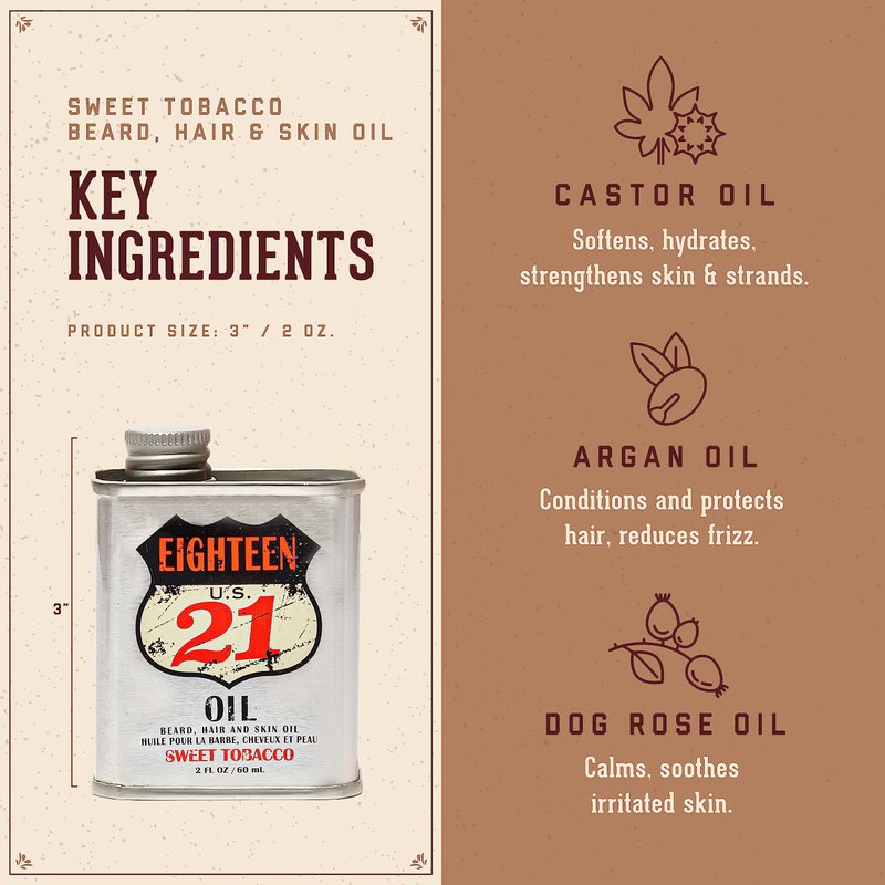 18.21 Man Made Hair, Skin & Beard Oil for Men Sweet Tobacco Scent - Non-Greasy, Conditioning Balm with Castor Seed, Jojoba, and Argan Oils - Premium Tattoo and Mustache Care Products 2oz