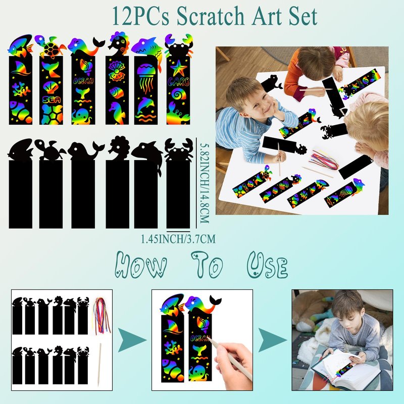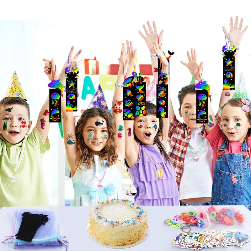 - GREAT VALUE AND VARIETY SHAPE---the package came with 184Pcs party favors in all. Include 12* sea animal bracelets, 12*necklaces, 12*cute sea animal rings, 12* sea animal keychains, 12*under the sea themed scratch bookmarks, 100Pcs stickers, 12* tattoos for kids, 12*Mesh Bags, enough for your party.