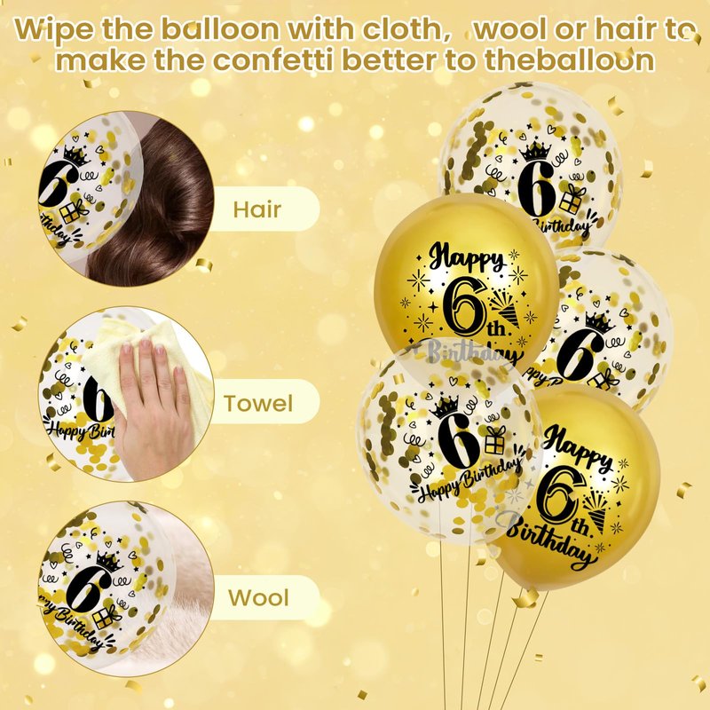 - Wide Application: 6th birthday confetti balloons for men can be used indoors or outdoors, you can use the gold ribbon in the package to tie the gold balloons anywhere you want to decorate, such as on shelves, fences, trees or garage doors, making your 6th birthday party more attractive