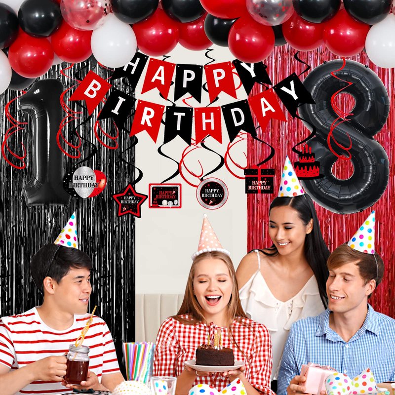 - 🎈Red and Black 18th Birthday Decorations for Boys Girls: Red and black theme birthday party decorations contains everything you need to prepare a impressive and gorgerous birthday party. Shiny foil fringe curtain and colorful decorations will be a great addition to birthday theme party, amazing to boost the atmosphere for your party over.
