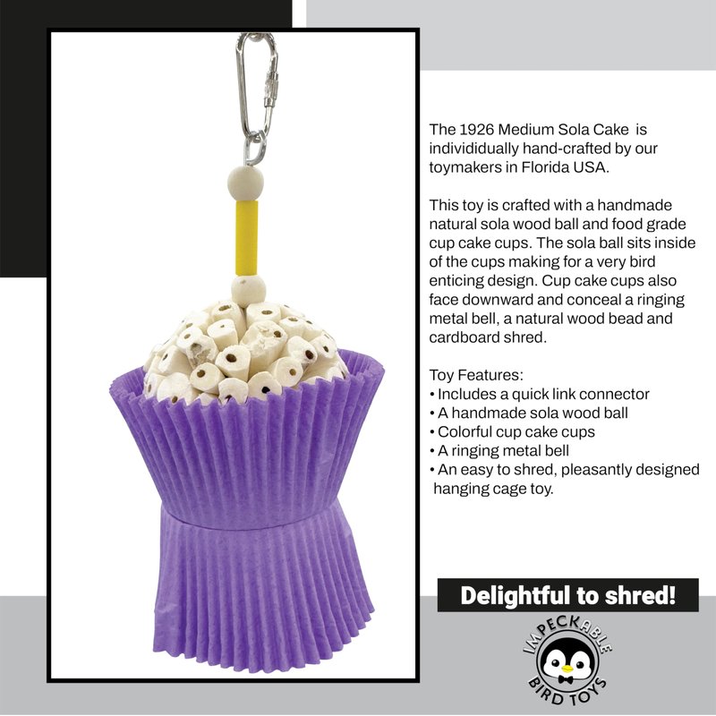 Introducing the 1926 Medium Sola Cake from Impeckable Bird Toys is an engaging bird toy handcrafted to provide hours of entertainment and enrichment for your feathered friend. Like its smaller counterpart, the 1925 Small Sola Cake, this medium-sized version is made from soft, natural sola wood, offering birds a satisfying texture to chew and shred. The core of the toy is surrounded by colorful cupcake liners, creating a visually appealing design that also adds an extra layer of fun as birds work to tear them apart. This toy is lightweight and easy to install in your bird’s cage using its secure metal clip, making it ideal for small to medium-sized birds who enjoy foraging and chewing activities. The sola wood and paper liners are completely bird-safe, allowing your pet to play without worry. This toy not only promotes mental stimulation but also encourages natural beak maintenance as birds chew and peck at the soft wood. Handcrafted in Florida, USA, the 1926 Medium Sola Cake is designed with care to ensure the safety and well-being of your pet. It’s perfect for providing essential physical and mental exercise while keeping birds entertained. ### Key Features: - Handcrafted from soft, chewable sola wood - Colorful cupcake liners for extra shredding fun - Promotes foraging and chewing instincts - Lightweight design with easy-to-attach clip - Ideal for small to medium-sized birds ### Specifications: - Height: 7 inches (17.8 cm) - Width: 4 inches (10.2 cm) - Weight: Under 3 ounces - Handcrafted in Florida, USA