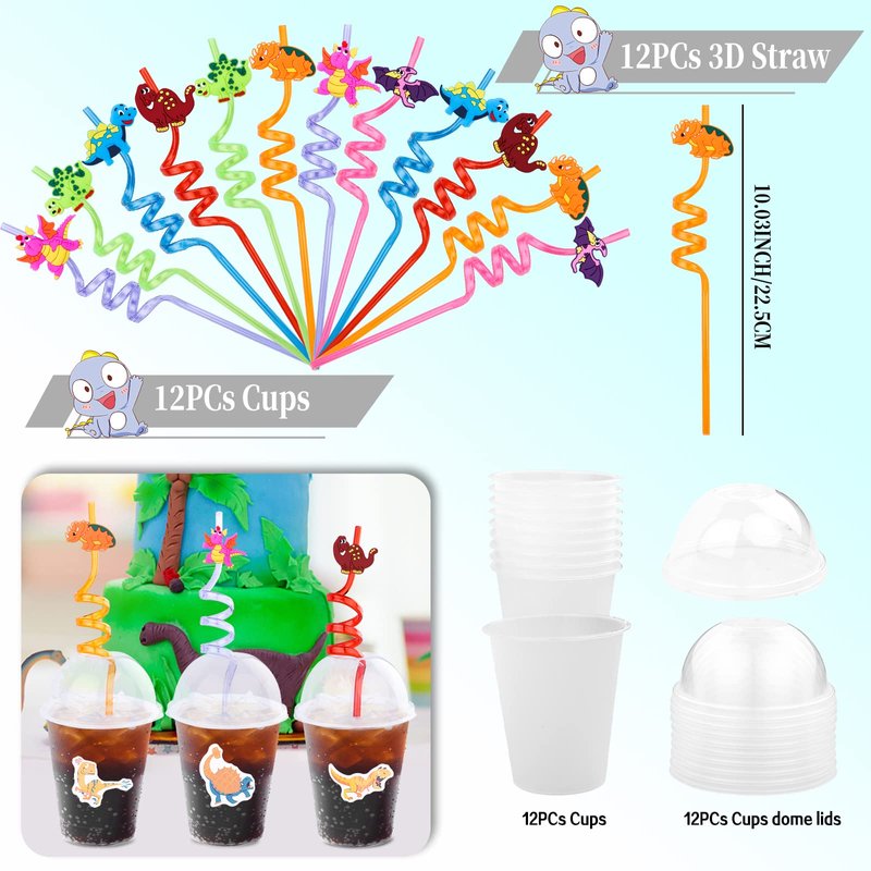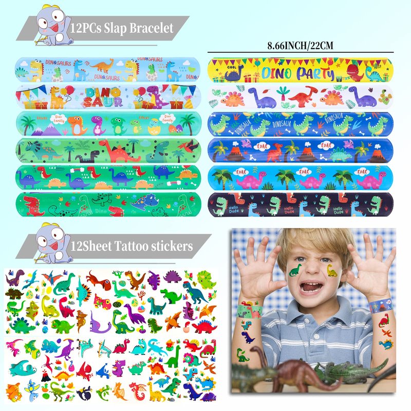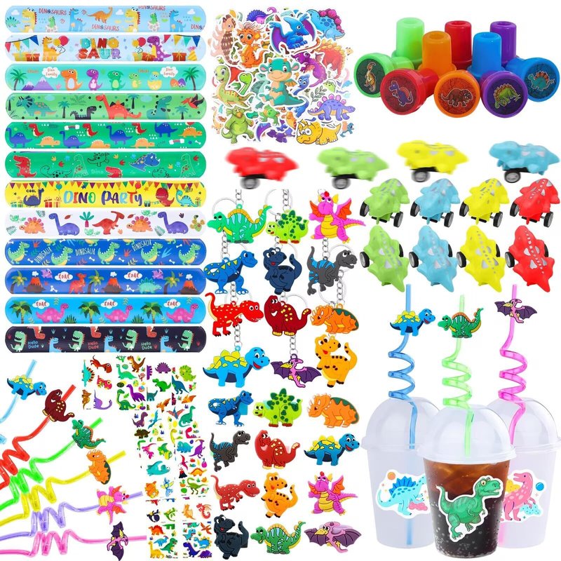 - VARUIOUS DINOSAUR PARTY FAVOSRS---our package including many kinds of favors, include dinosaur slap bracelets *12, dinosaur straws*12, cups*12, rings*12, stamper*10, dinosaur keychains*12, dinosaur stickers*100, tamperary tattoos*12, dinosaur mini toys*12, enough styles and quality for kids birthday party favors!