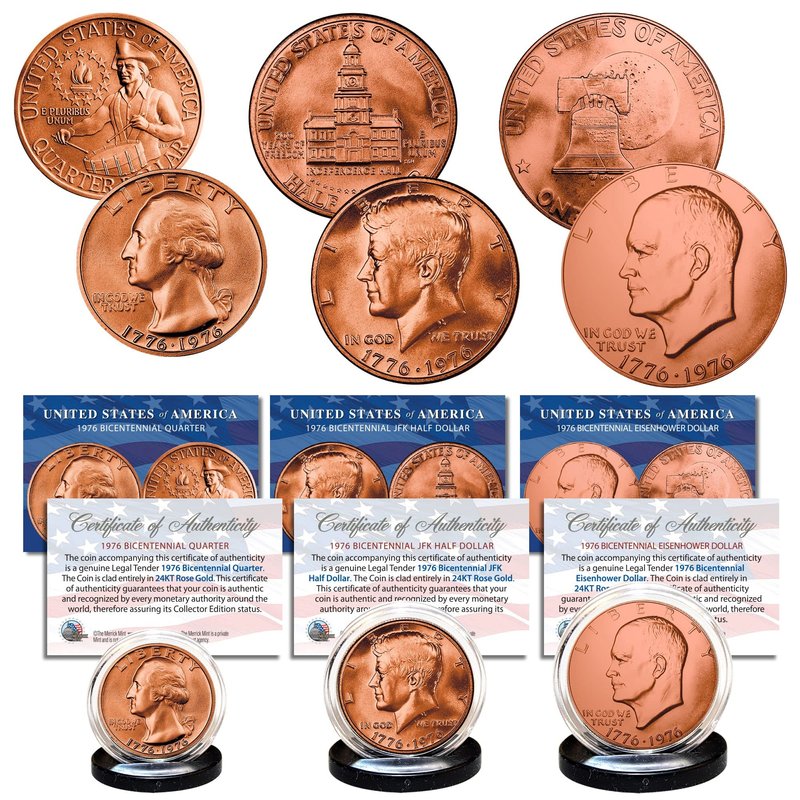 - The BICENTENNIAL COIN COLLECTION is a Rose Gold Plated 3-coin set which includes: 1976 Kennedy Half Dollar, 1976 Eisenhower Dollar, and 1976 Washington Quarter.