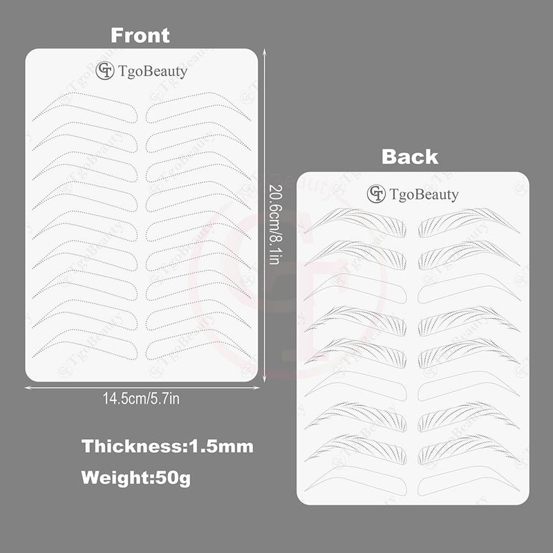 - Double Sided Designs: 9 pairs empty eyebrow shapes with thin tracer dots on the front, full hairstroke brow frames with 3 different common patterns on the back.