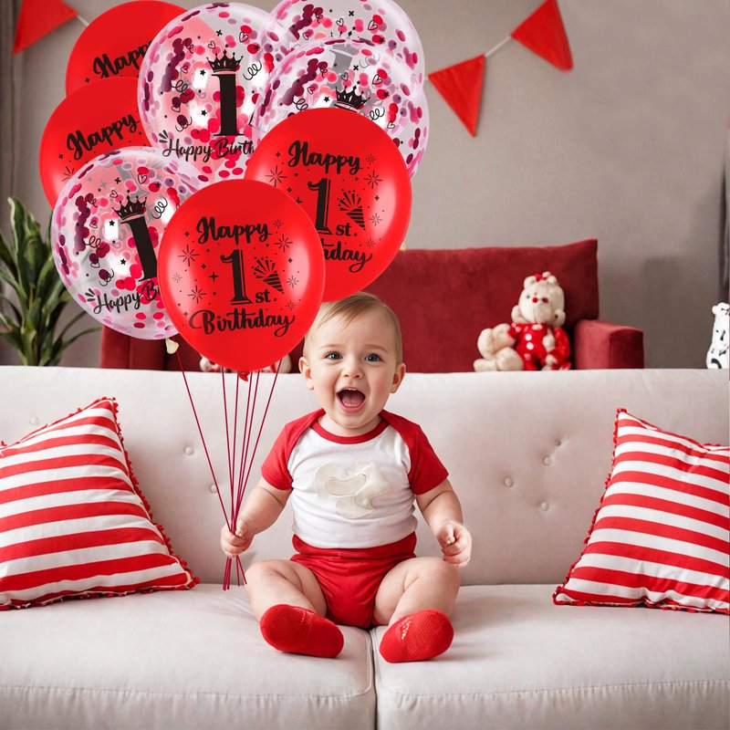 - What You Get:These are such cute, red 1st birthday balloons. The package comes with 9 pcs red 1st birthday latex balloons, 9 pcs 1st confetti balloons, and 1 pc ribbon. A very nice mixture set that compliments each color