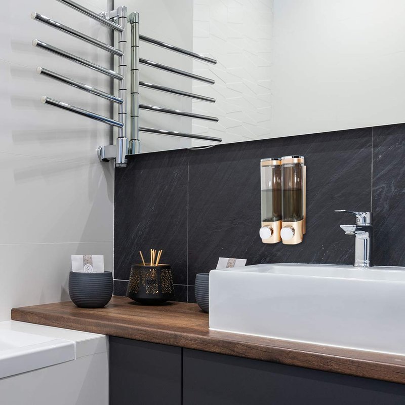 The double liquid dispenser simplifies the bathroom or shower room and reduces the mess of bottles.