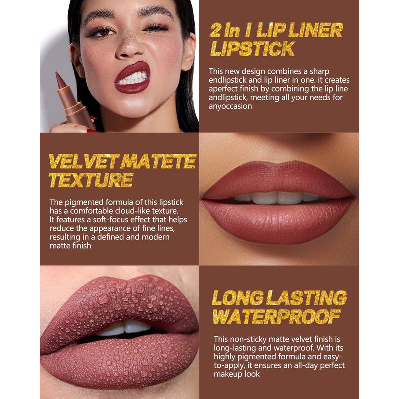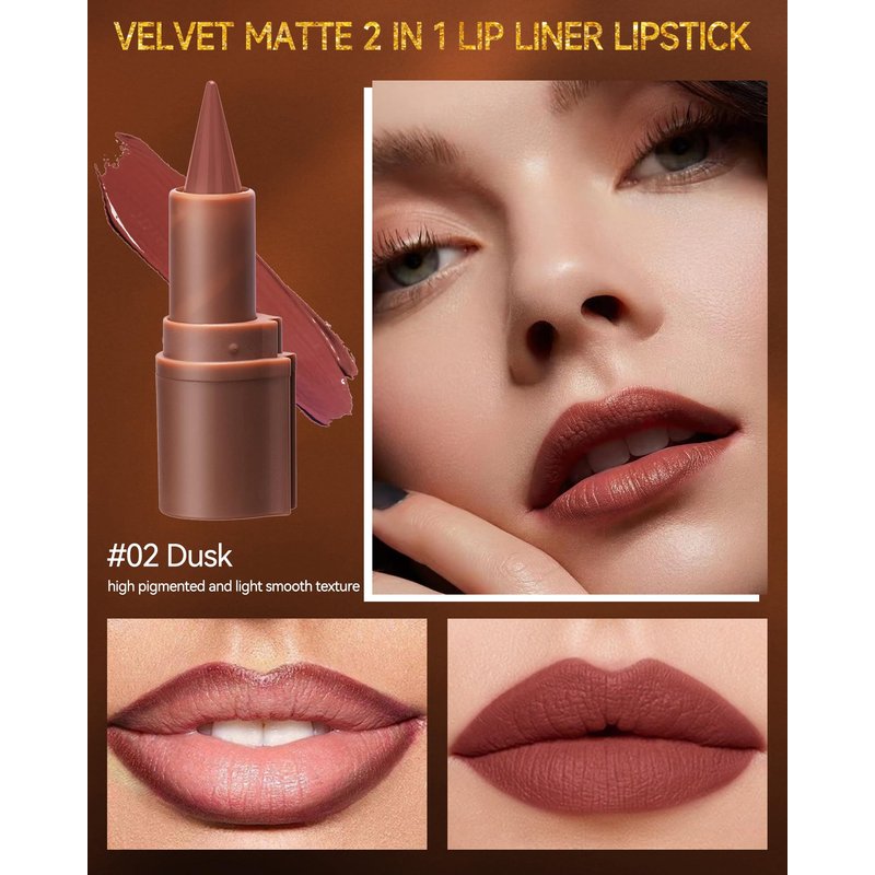2 in 1 Lip Liner Lipstick, Dusk Brown Lip Liner Lip Gloss, Velvet Matte Sharpened Head Lip Tint Stain, Long Lasting Waterproof,Highly Pigmented Non-sticky Tinted Lip Balm, Lip Makeup for Women-02