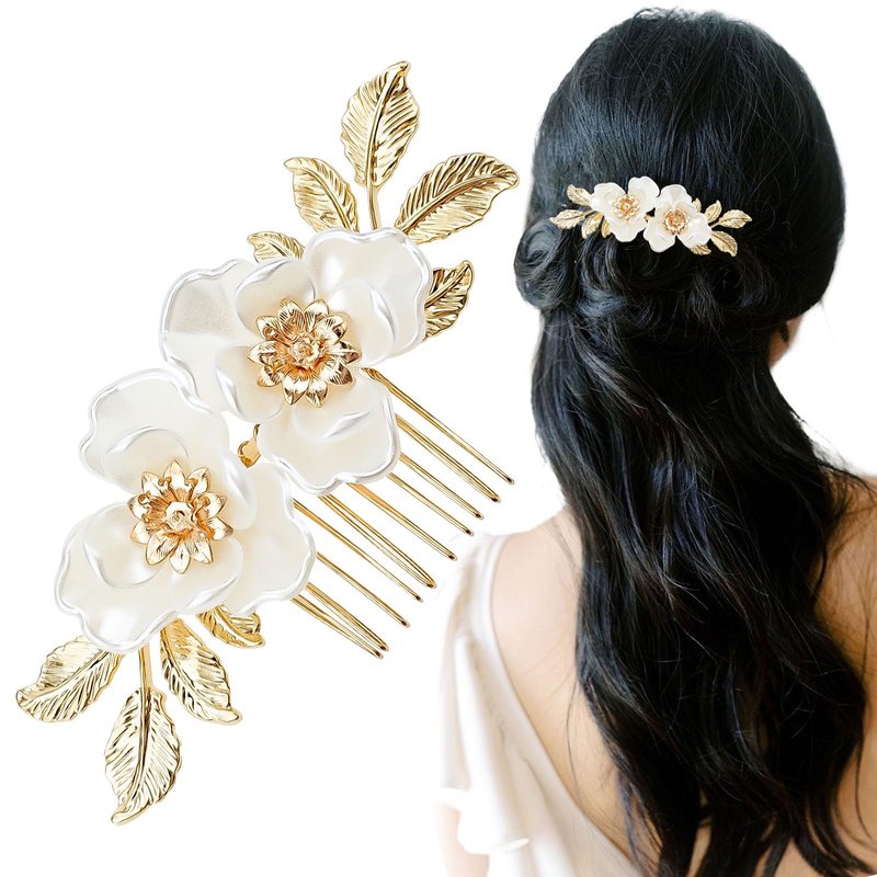 - 【DESIGN】- Exquisite white flower and gold leaf hair comb, perfect for weddings, proms, and special occasions.