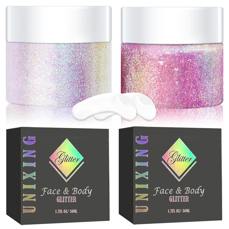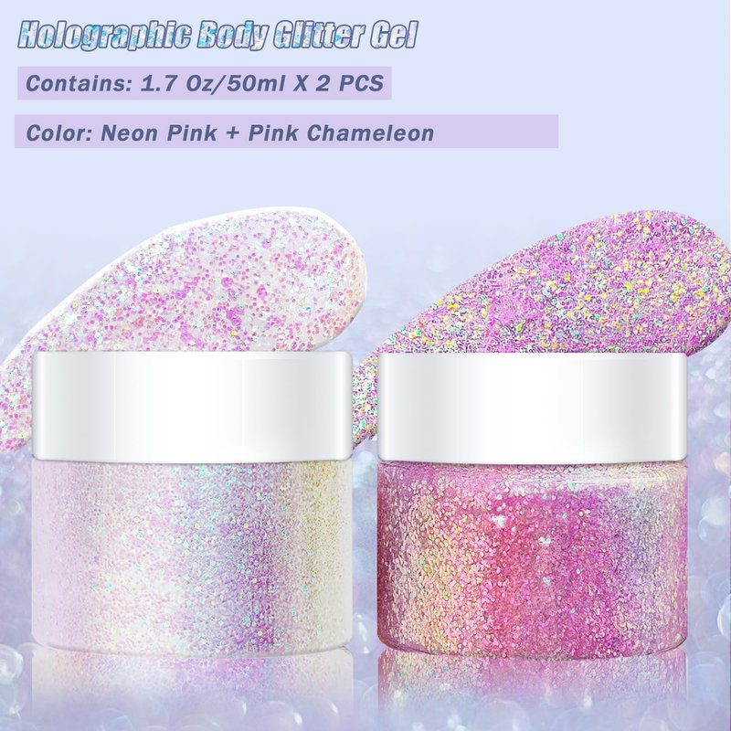 - Cosmetic-Grade Glitter Gel: Unixing holographi face and body glitter gel is made of high-quality, safe and non irritating cosmetic-grade materials. It is Vegan & Cruelty Free. the glitter is bright and color changing under light. Package contains 2 jars of body glitter gel. Each bottle contains 1.7 Oz/50ml.Color:Neon Pink + Pink Chameleon Glitter Gel