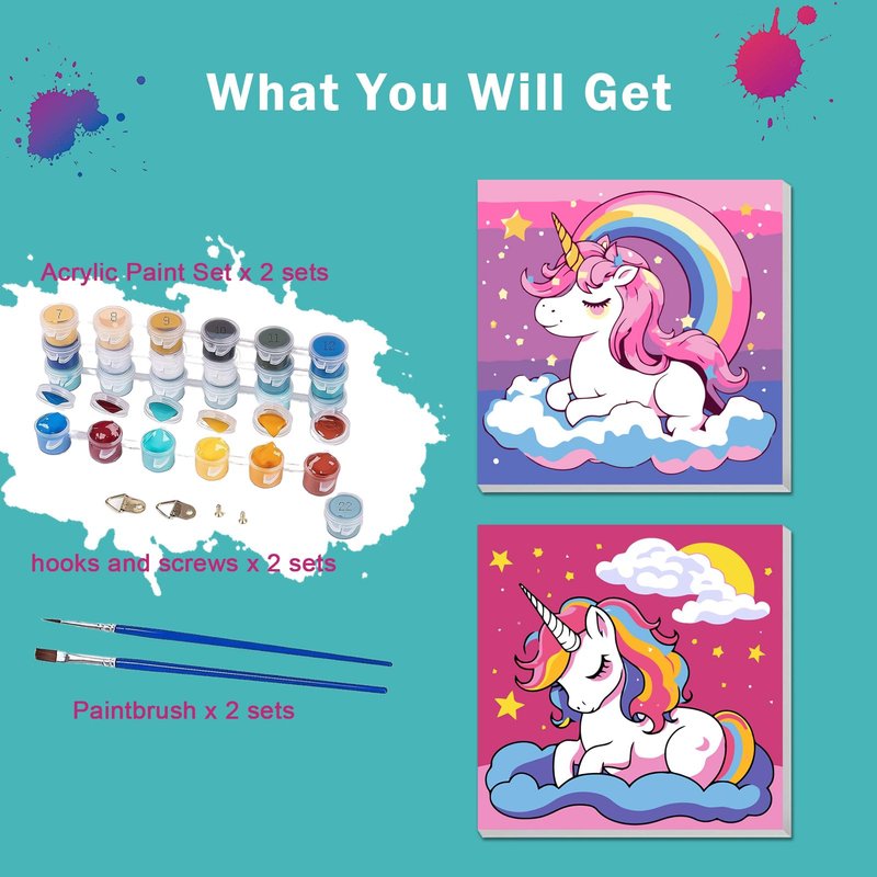 - What You Get: Kids paint by number kits age 4-8 comes with everything you need. 2 pack paint by numbers kit for kids including: 2 pre-printed textured art canvases (with frames), 4 high-quality paint brushes, 4 hook nails, and 2 matching acrylic paints.