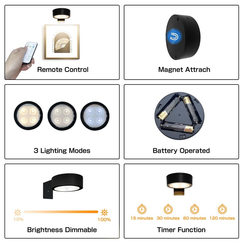 - [Auto OFF Timer Picture Lights]There is timer function on the remote,you can set the picture light to turn OFF automatically in 15/30/60/120 minutes.