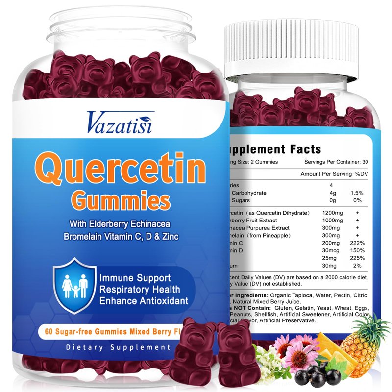 - 8 in1 Quercetin Complex, Get Multiple Benefits: Per serving 2 gummies are formulated with 1200 mg quercetin, 1000 mg elderberry extract, 300 mg echinacea extract, 300 mg bromelain, 200 mg vitamin C, 30 mcg vitamin D, 25 mg zinc and 30 mg sodium, which promote a well-balanced immune system, support gut health, strengthen antioxidant, build strong muscles and joints, and nourish skin and anti-aging